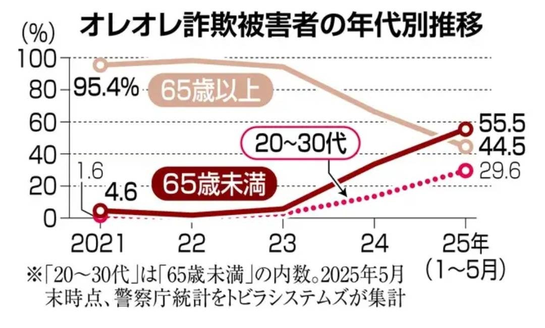 同社の分析によると、オレオレ詐欺被害者に占める65歳未満の比率は、2022年が1.8%、2023年が5.7%だったが、2024年には33.6%と急上昇。今年は5月末までに55.5%となり、これまで大勢を占めていた「65歳以上」を初めて上回った。若年化の原因は20~30代の比率の上昇にあるという。2022年は0.5%、2023年は2.7%だったが、2024年に13.5%と高まり、今年(5月末まで)は29.6%に上昇している。