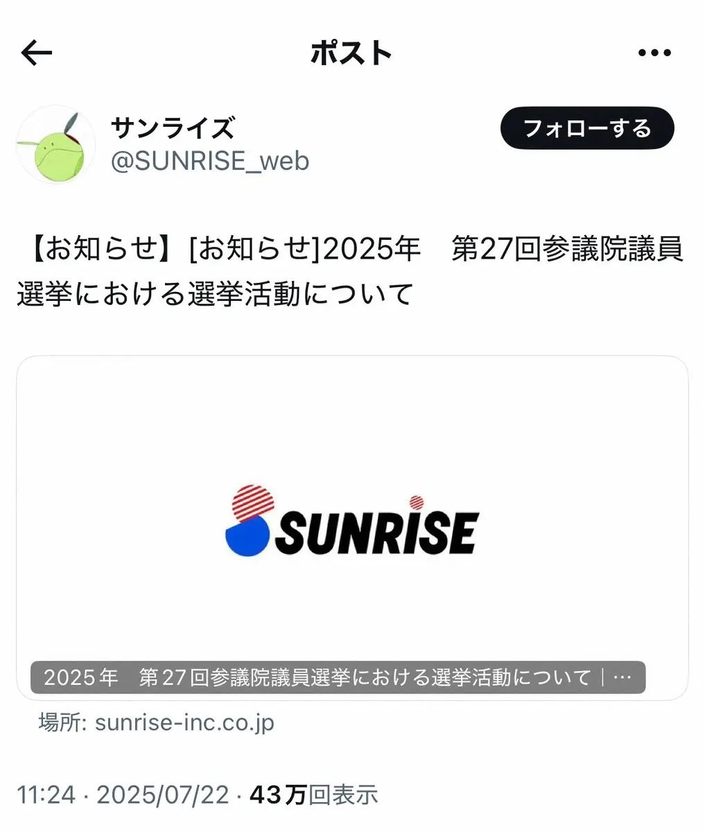 「2025年参議院選挙において、ガンダムシリーズのキャラクターをイメージあるいは強く想起させるコスプレ風衣装や、シチュエーションによる動画・SNS投稿等を用いた選挙活動を行っている候補者がいらっしゃいましたが、株式会社バンダイナムコフィルムワークス(SUNRISE studios)が認可したものではなく、弊社が特定の候補者を支持することはございません」と訴えた。