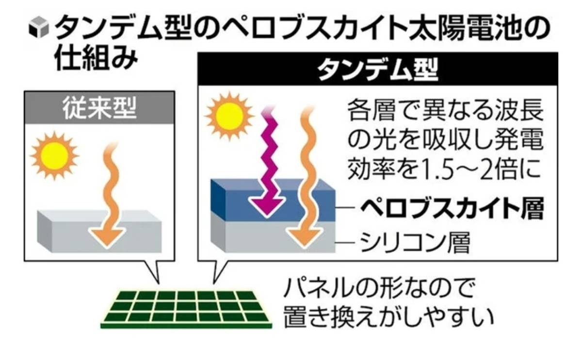 今回新たに、シリコンの層を組み合わせたパネル状の「タンデム型」と呼ばれるペロブスカイト太陽電池を支援対象とする。発電効率が従来型の1・5~2倍程度と高い上、既存の太陽光パネルに使う架台や配線を活用でき、置き換えを進めやすいのが利点だ。