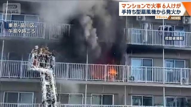 東京・品川区のマンションで火事があり、6人がけがをしました。室内にあった手持ち型の扇風機が発火した可能性があります。