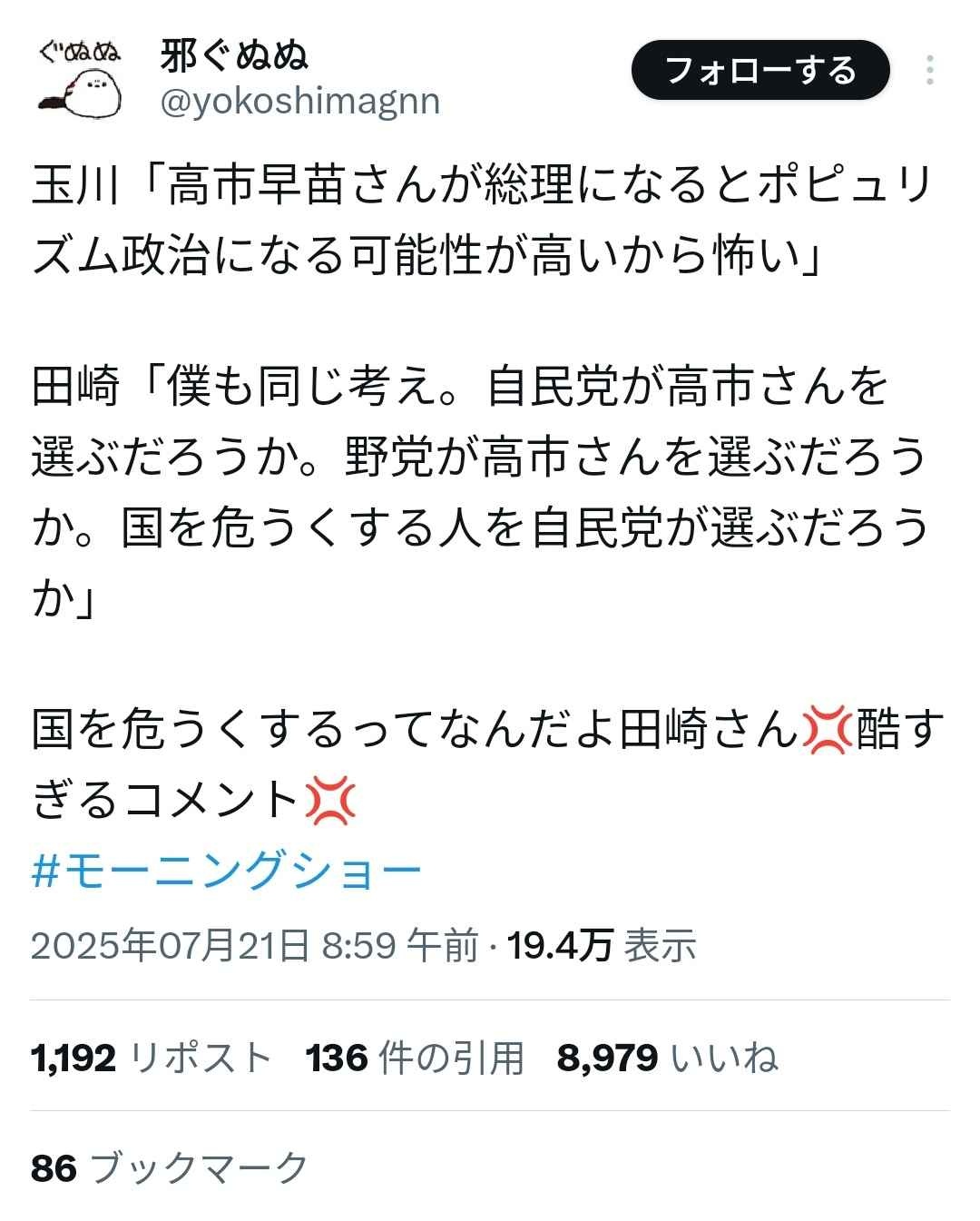 高市じゃ首班指名通らないし自民党が危うくなりますよってニヤニヤしてたからな
