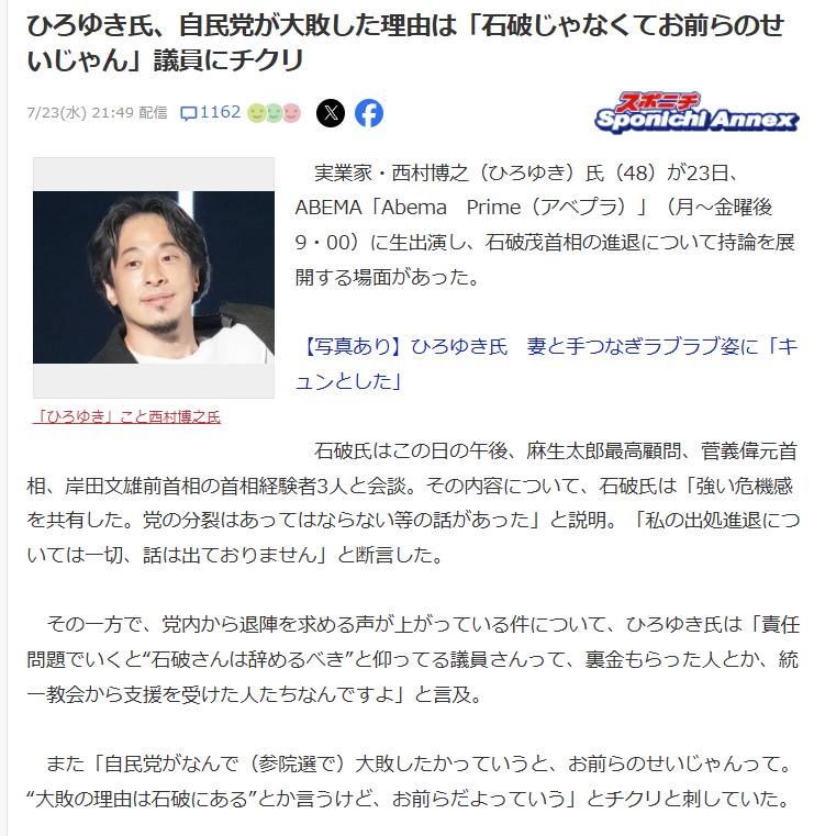 【正論】ひろゆき「自民大敗したのは石破さんじゃなくて、お前ら裏金統一議員のせいです」