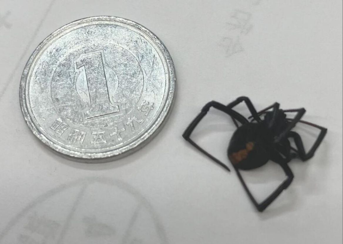 一般的にセアカゴケグモの大きさは0.7センチ~1センチほど。有毒の雌は体が黒く、腹部の背面に赤い模様があるのが特徴。
