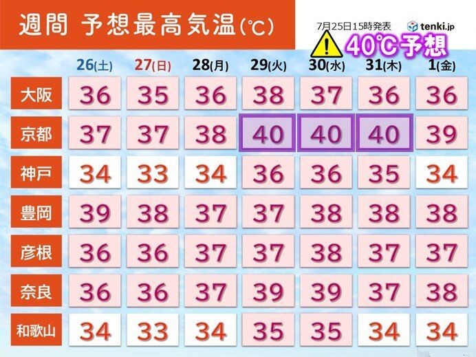 近畿地方では、来週にかけてさらに気温が高くなり、29日(火)~8月1日(金)ごろは京都など最高気温が40℃に達する所があるでしょう。近畿地方で過去に最高気温が40℃以上となったのは、わずか1地点で一度きりです。来週は経験したことのないような猛暑となる恐れがあり、熱中症に厳重な警戒が必要です。熱中症は予防が肝心ですが、もしもの時に備えて、熱中症が疑われた場合の応急処置を確認しておいてください。