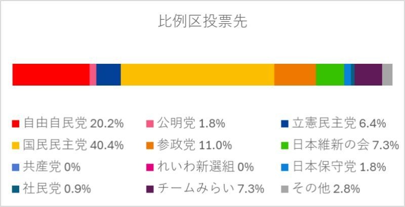 投票に行った塾生の比例区投票先としては上から国民民主党(40.4%)、自由民主党(20.2%)、参政党(11.0%)、日本維新の会(7.3%)、チームみらい(7.3%)、立憲民主党(6.4%)、公明党(1.8%)、日本保守党(1.8%)、社会民主党(0.9%)と続いた。投票先を覚えていない含むその他は2.8%であった。また、今回の調査では共産党及びれいわ新選組に投票した人は確認できなかった。