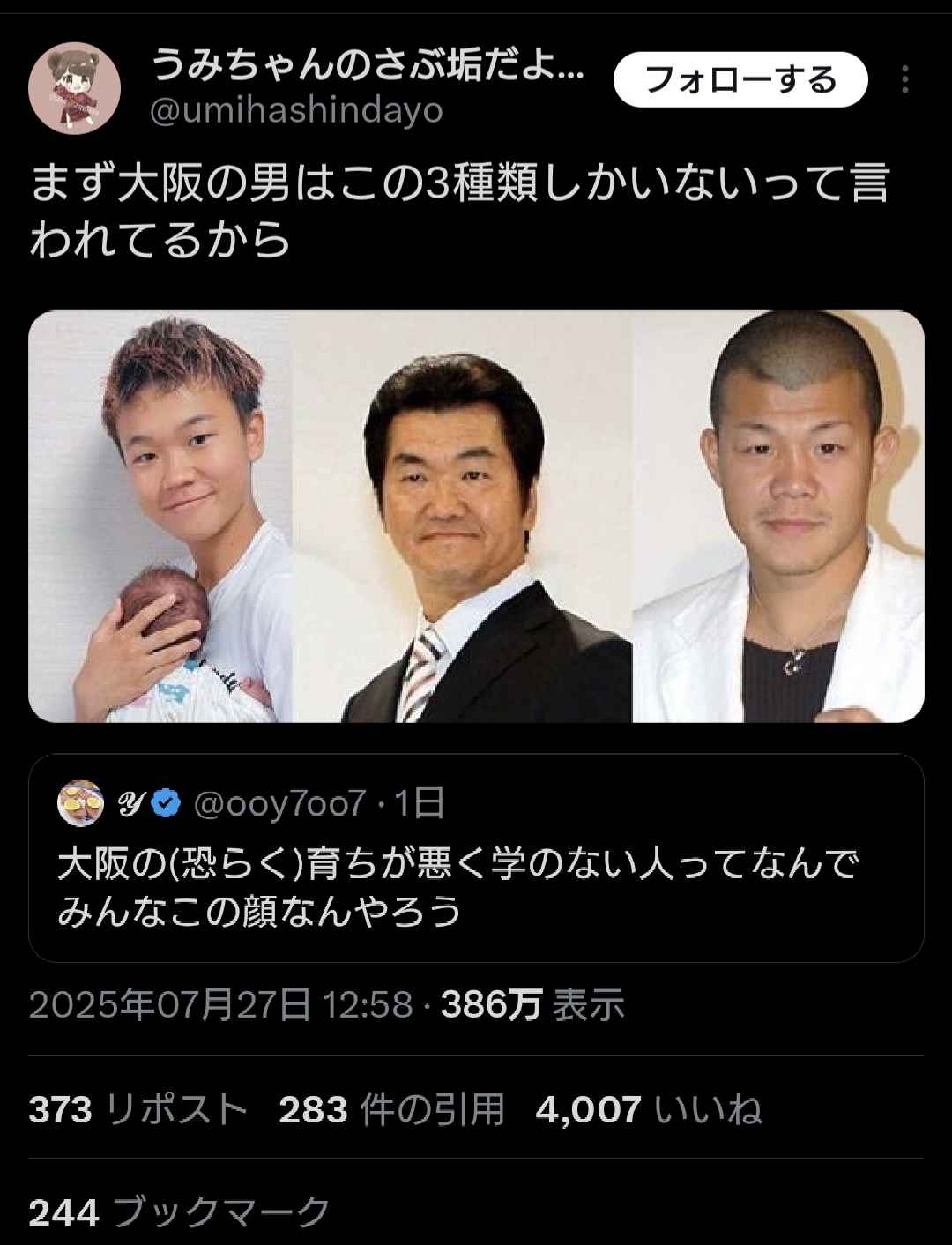 【衝撃】大阪の男、わずか3種類しかいなかった