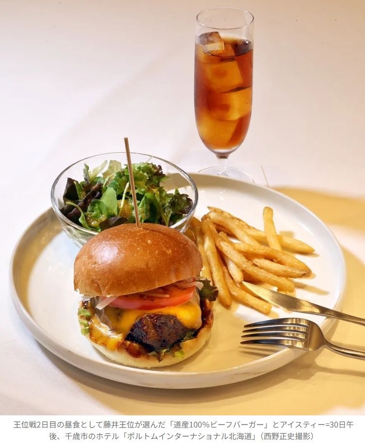藤井王位は肉厚パテが主役の「道産牛100%のビーフバーガー」とアイスティー。・参考
