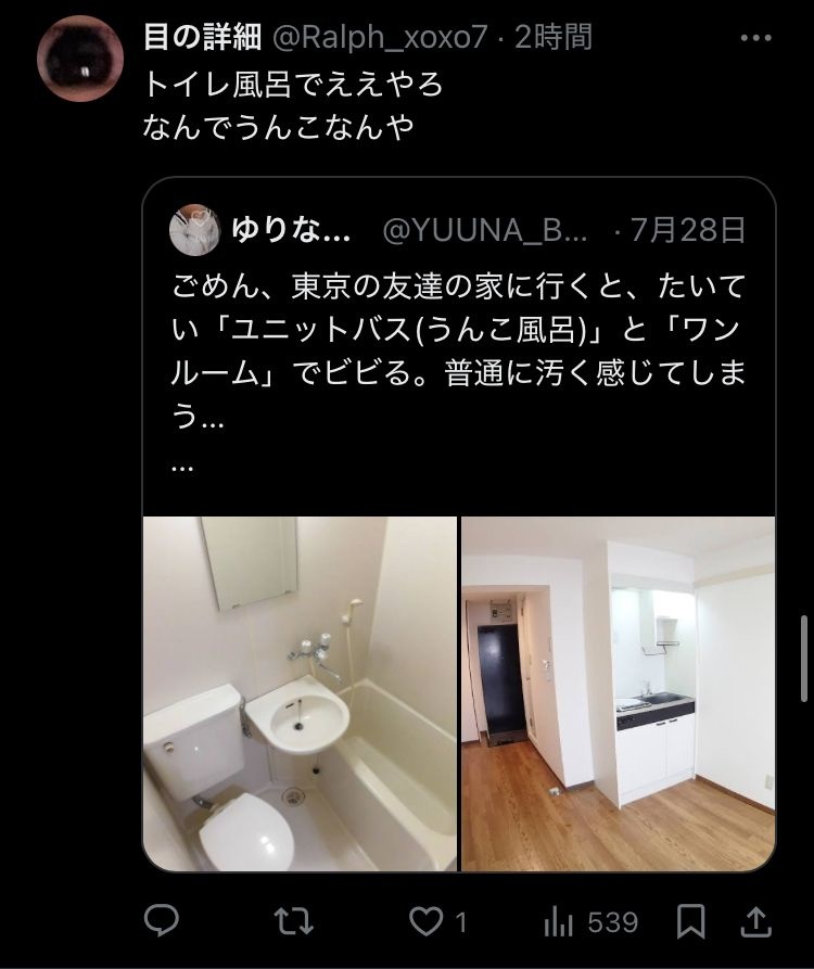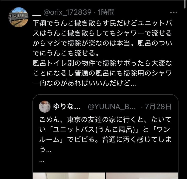 そういやユニットバスが嫌で風呂トイレ別(風呂は1Rに鎮座)って後輩いたわ