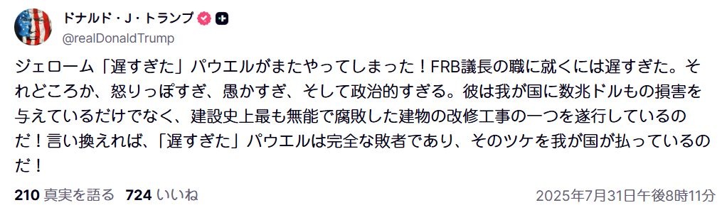 トランプ「遅すぎパウエルはまたもやらかした!愚かで政治的すぎてFRB議長には不適格!ツケを払わされているのが我々国民!