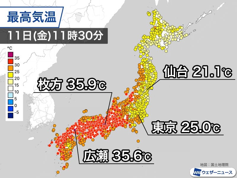 今日11日(金)は西と東の気温差が明瞭になっています。西日本では35℃前後まで上がっている所がある一方、関東や東北太平洋側は25℃に届かない所があり、少し涼しいくらいです。