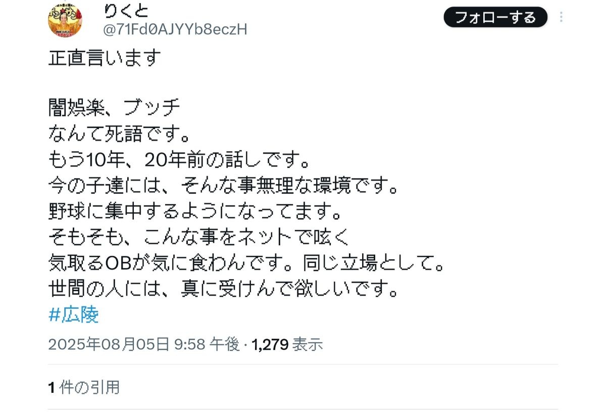 日本高野連は5日に3月に審議をして厳重注意措置として事案があったと発表。部内で暴力があったとする投稿がSNSで拡散していた。日本高野連はこの日、「SNSなどで拡散されている事案の内容と、広陵高校が日本高野連に報告した内容に違いがありましたが、学校側から6日、これまで報告していた内容以外に新たな事実関係はない旨、表明がありました。