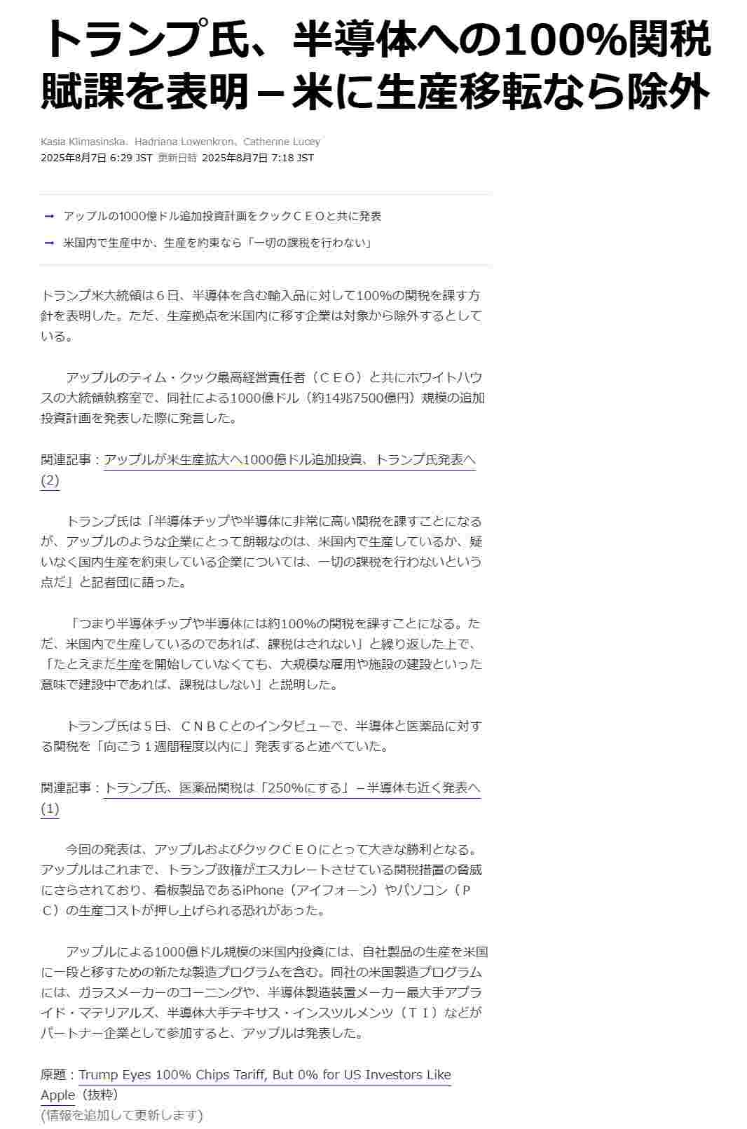エヌビディアとアップルは日本がくれた80兆でアメリカに工場建てる計画あるから関税免除される、だから時間外爆上げ中