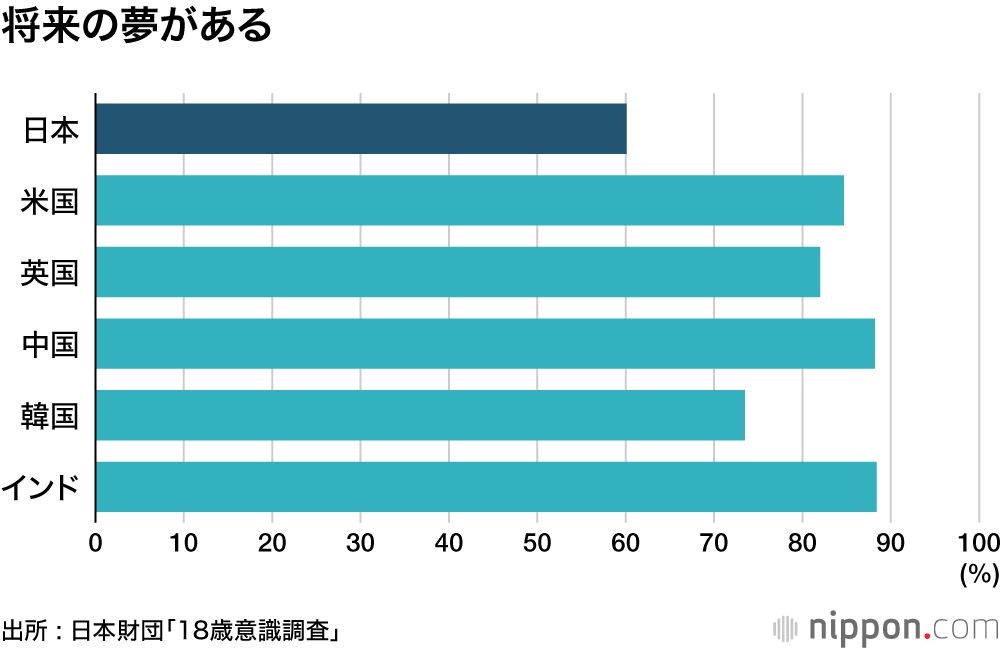 日本財団が日本、米国、英国、中国、韓国、インドの6カ国で各1000人の若者を対象に実施した「18歳意識調査」。「自分自身に将来の夢があるか」との問に、「どちらかといえば」も含めて「ある」と回答したのは、インド88.4%、中国88.2%に対し、日本は60.1%にとどまった。