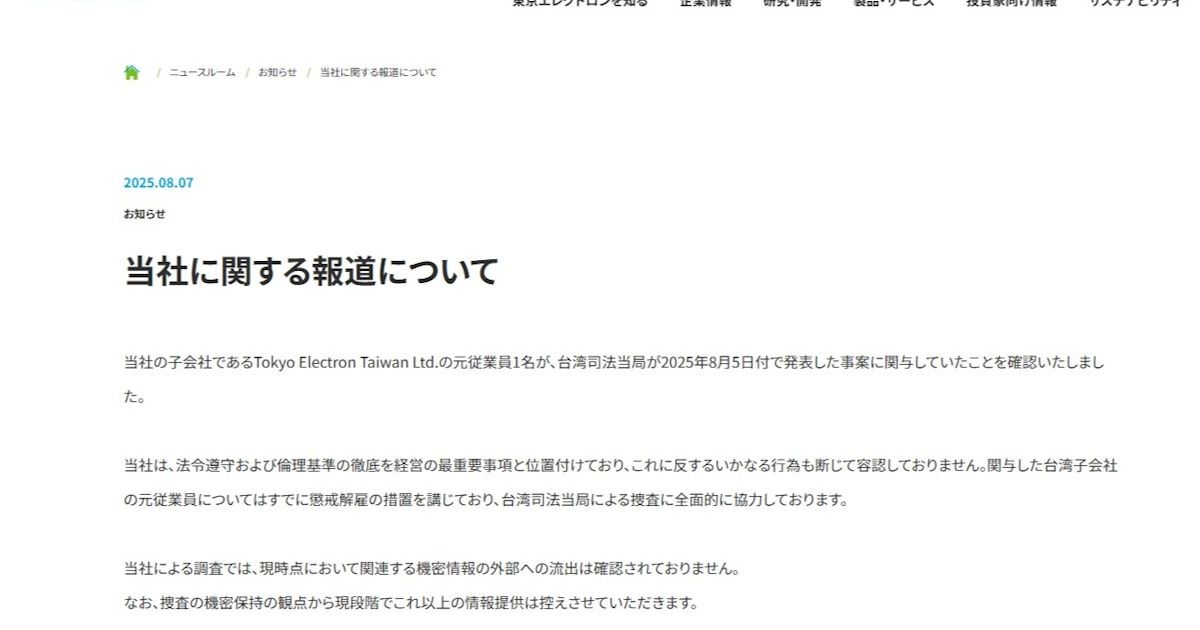 東京エレクトロン「従業員がスパイ行為に関与していたが、もう懲戒解雇済み😤」無事解決へ