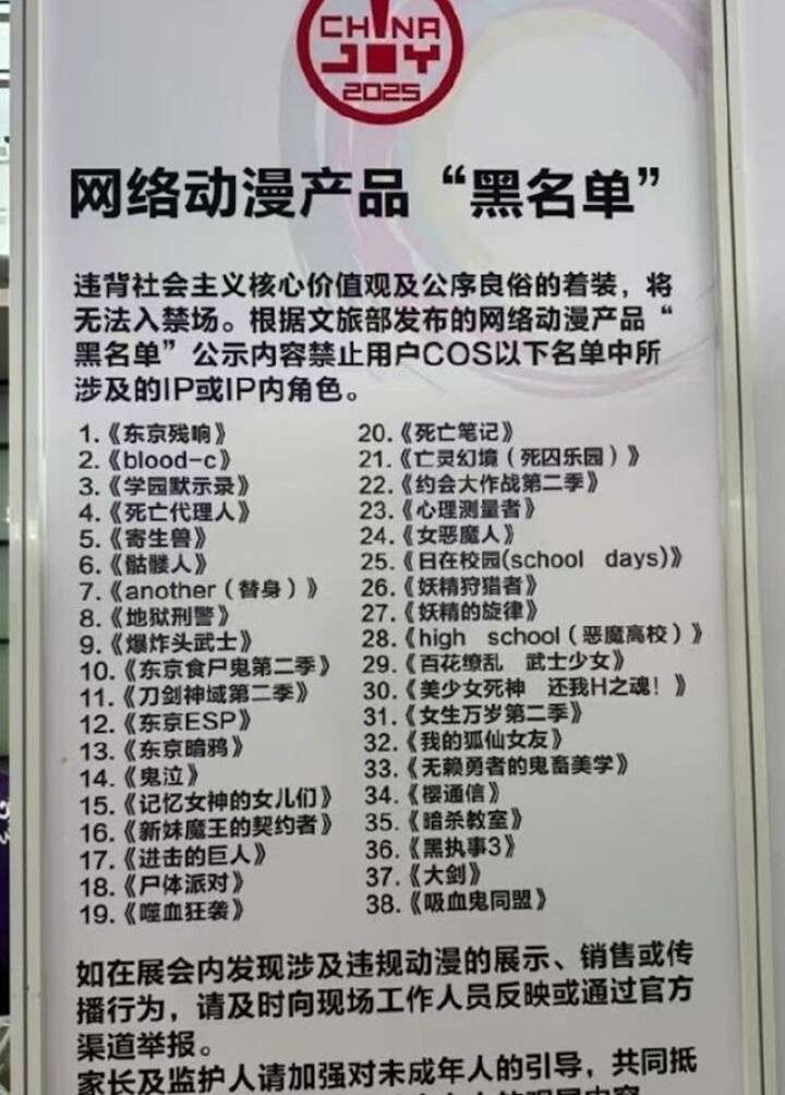 そのリストには、「社会主義の核心的価値観および公序良俗に反する服装は入場禁止」と明記され、「DEATH NOTE」や「進撃の巨人」、「寄生獣」、「School Days」、「東京喰種トーキョーグール」、「暗殺教室」、「黑執事」、「かのこん」、「学園黙示録 HIGHSCHOOL OF THE DEAD」、「ソードアート・オンライン」、「デビルメイクライ」など、多数の人気アニメ作品のキャラクターのコスプレが禁止されていた。