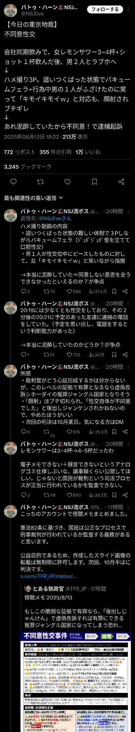 ナンパもハメ撮りも問題なく同意のまま行われていたのにワンナイト経験ないチー牛裁判官のせいで犯罪者になって可哀そうって意見がある模様