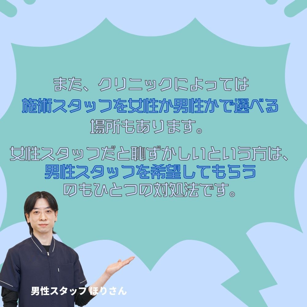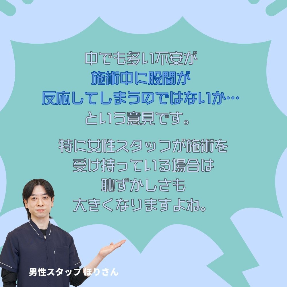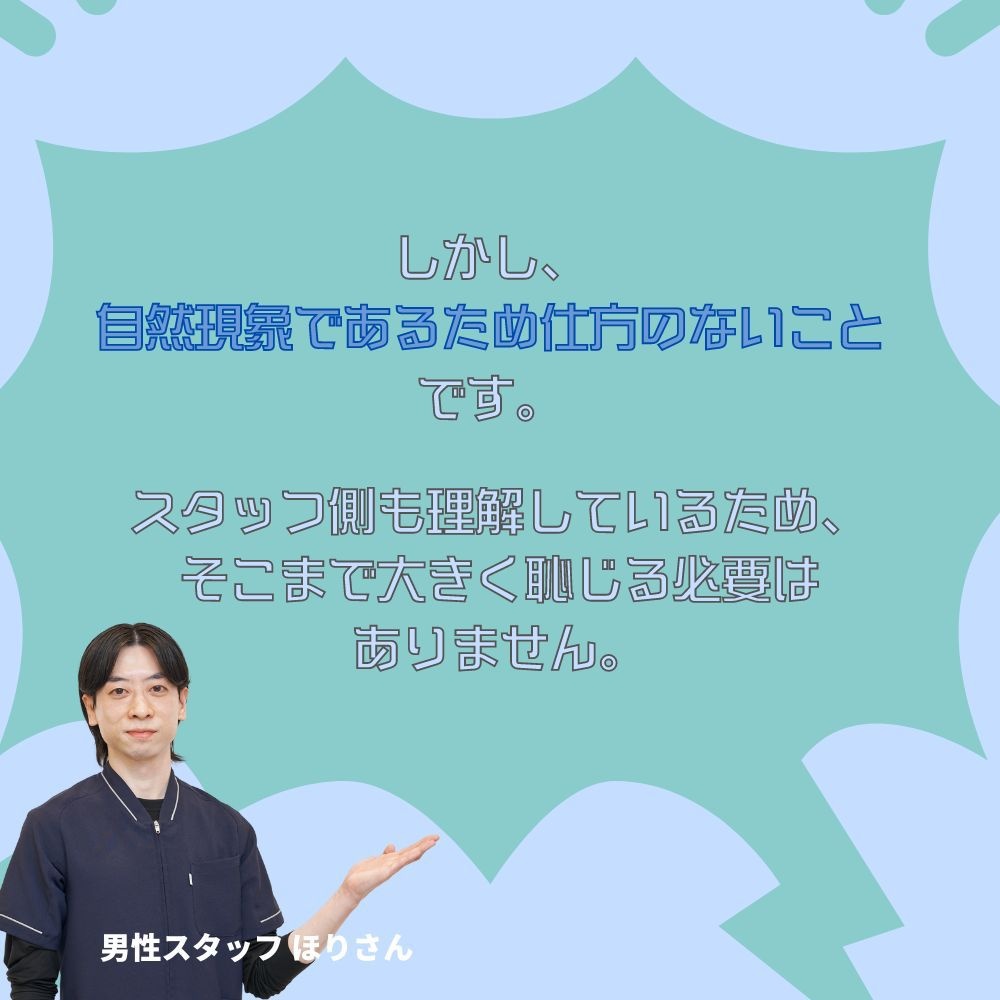 スタッフ側も理解しているのでそこまで恥じる必要はありません✨それでも気になる方は、施術スタッフを男性にしてもらうなど対処してもらいましょう🙆🙆♂