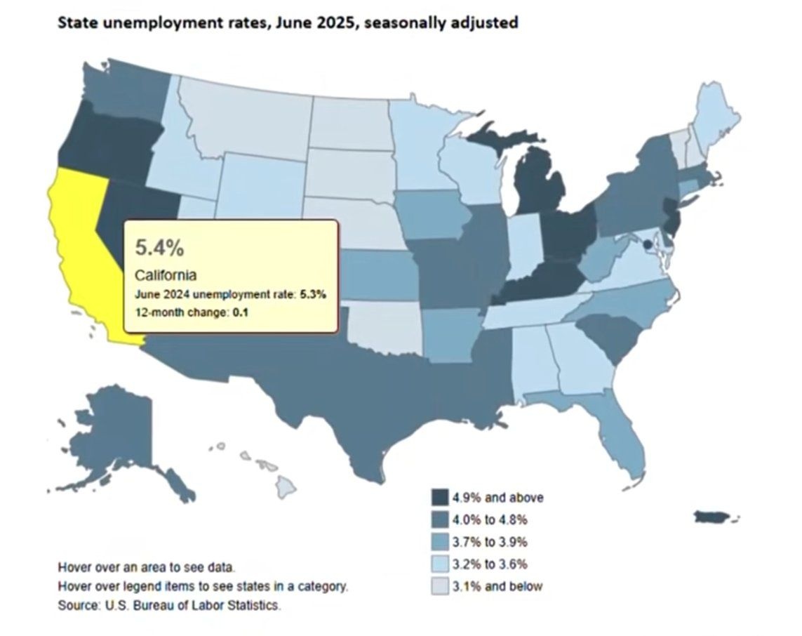 カリフォルニアの失業率が全米1位に。最新のレポートによると、失業率が5.4%に上昇。主にホワイトカラー職の求人が激減。考えられる原因