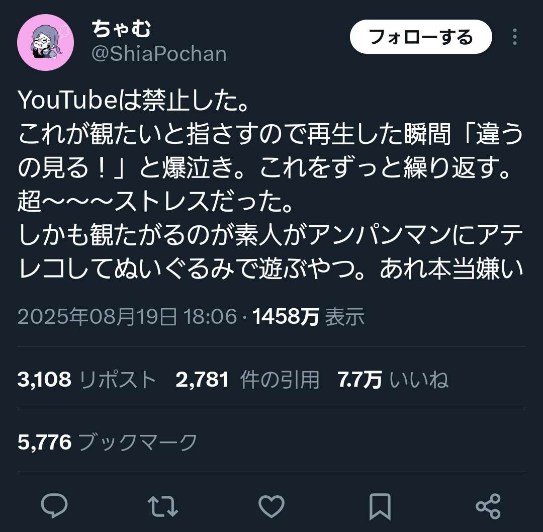 ほんとそれ。YouTube禁止というより親をスマホ禁止にしたほうがいいレベル