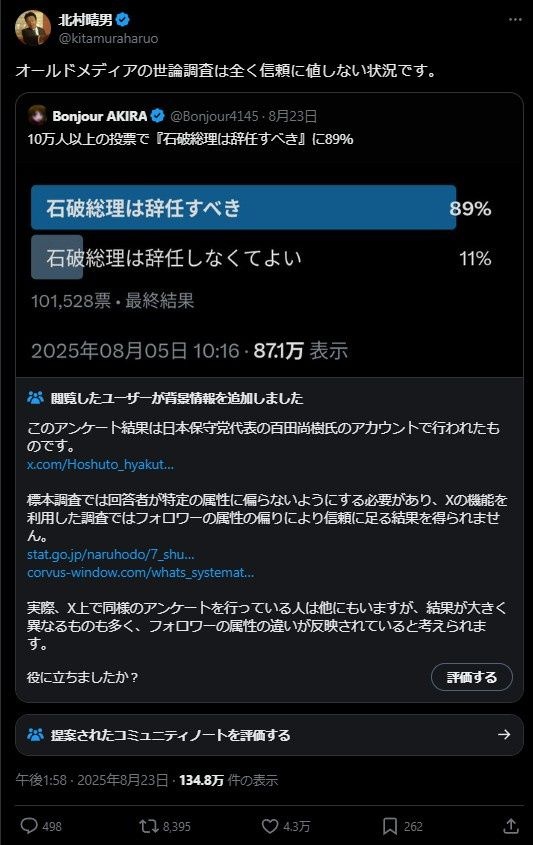 キタムラって誰だよ、そんな奴の意見で世論調査が信頼できないとか言うのは早計じゃね。 タイトル中の『石破』にトリガーして、加速スクリプトが起動。 BE[834922174]は通算573スレで24671レスのスクリプト加速を記録。