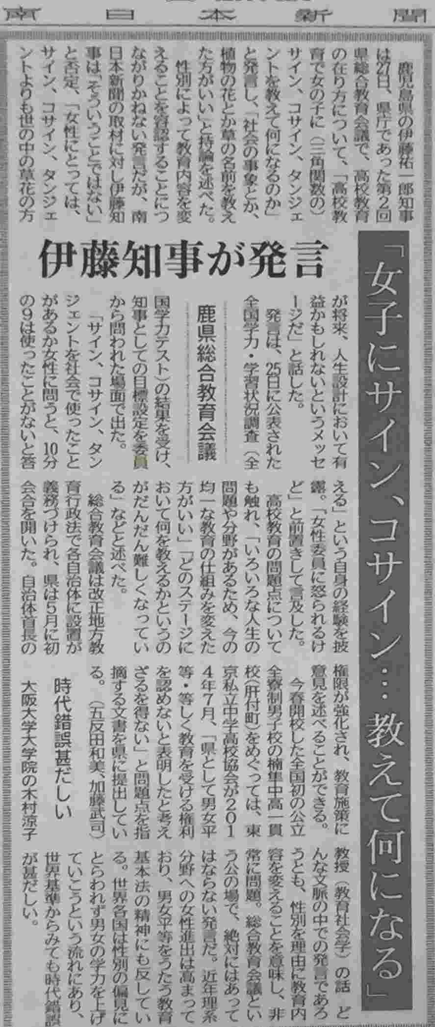 鹿児島県の伊藤祐一郎知事が27日、「サイン、コサイン、タンジェントを女の子に教えて何になる?」などと発言した。