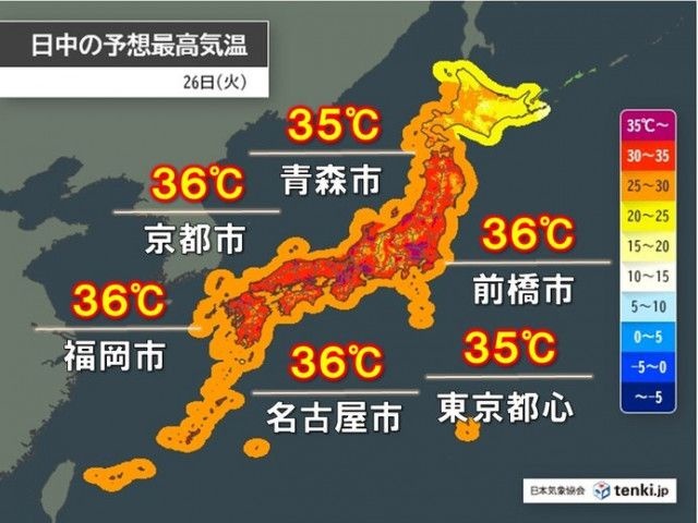 今日26日も東日本や西日本は高気圧に覆われるでしょう。強い日差しが照り付けて、猛烈な暑さとなる見込みです。最高気温は、東北から九州では35℃前後の所が多いでしょう。前橋市や名古屋市、京都市、福岡市などでは36℃と体温並みの暑さとなりそうです。青森市でも35℃と、40日ぶりに猛暑日となるでしょう。