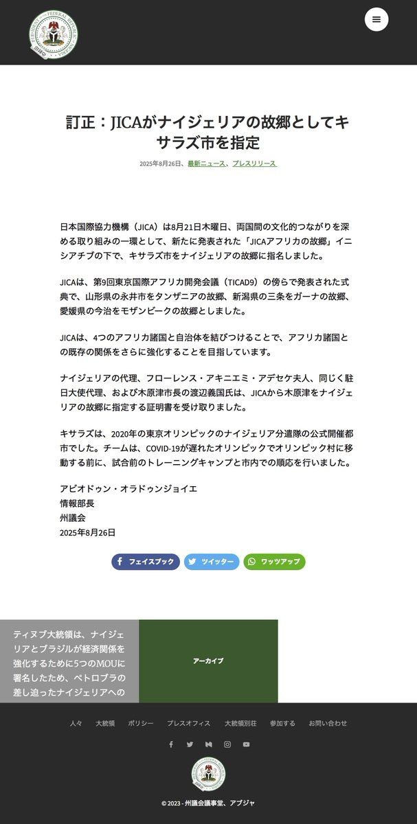 アフリカ支援期間が木更津とナイジェリアの友好都市みたいなのを結んだって話に尾鰭がついただけ?