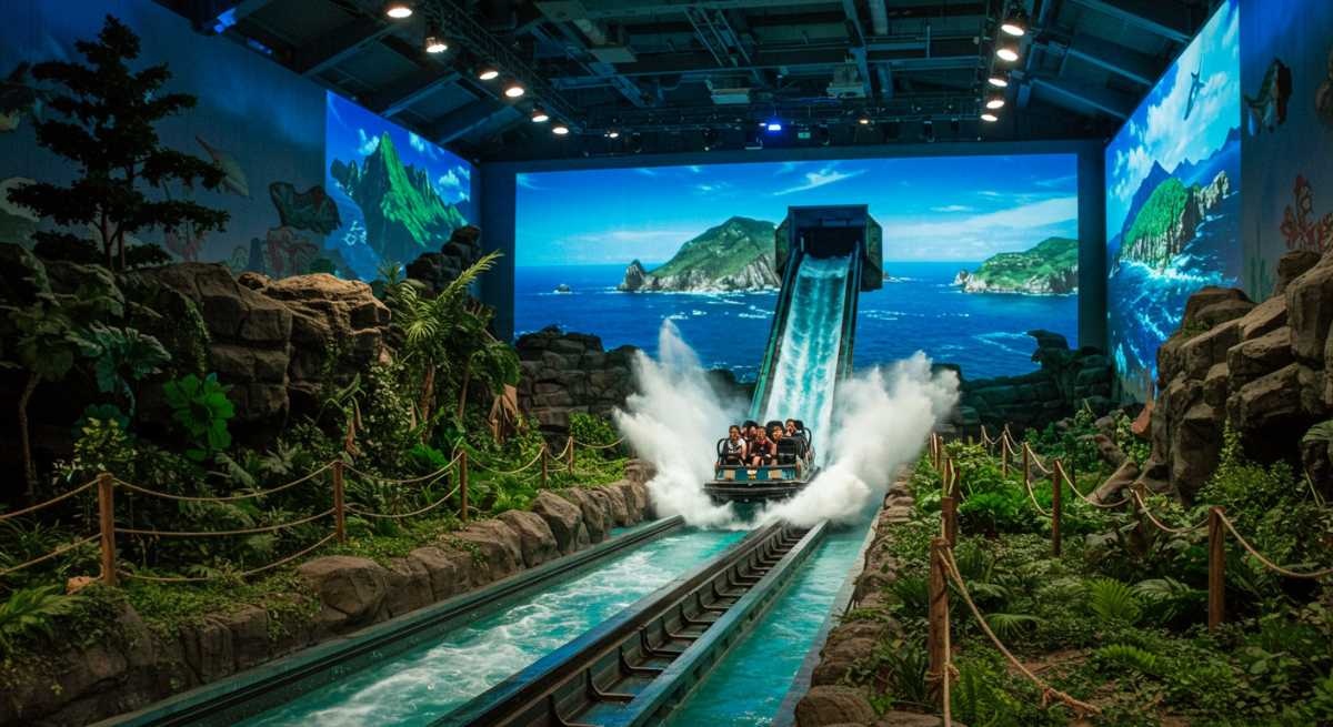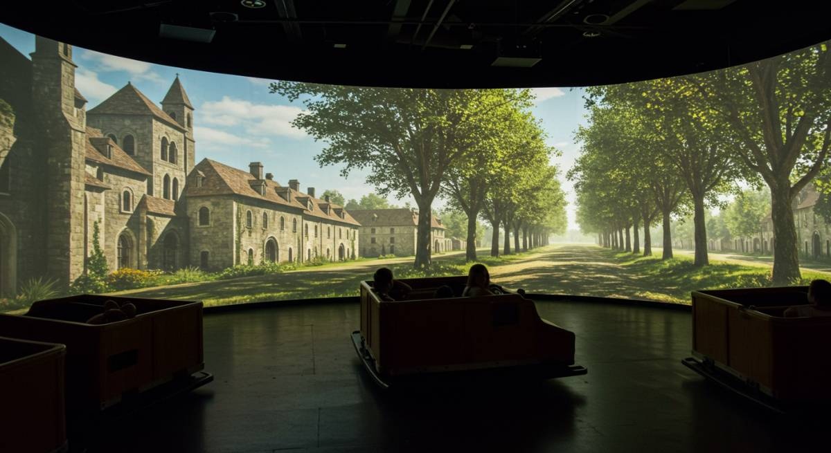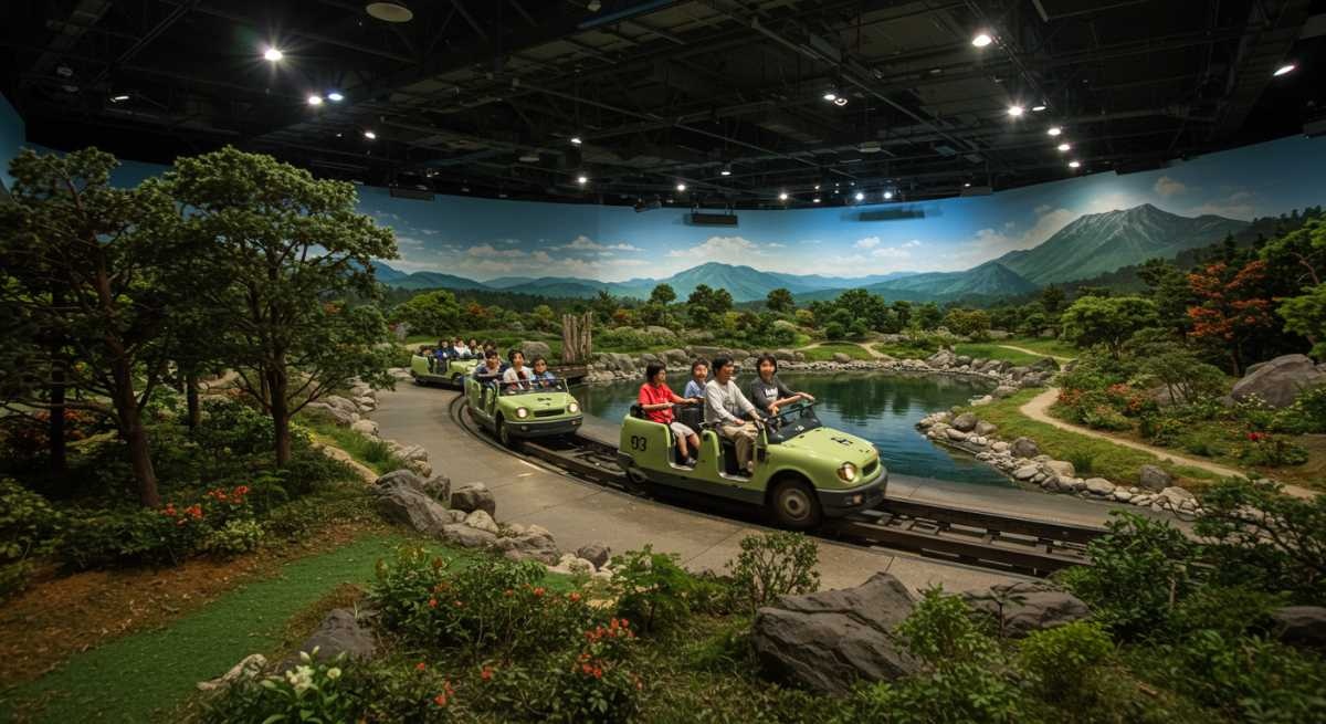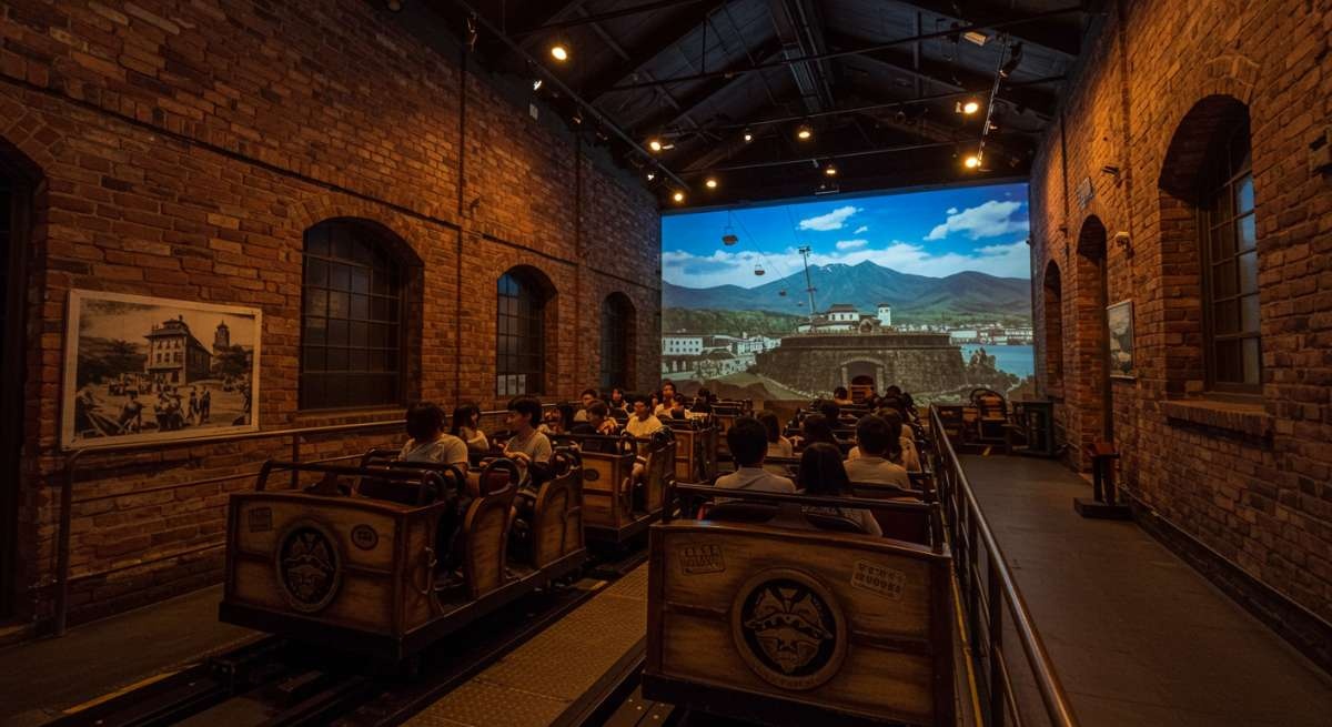 下から見上げるとただの堀でしかない五稜郭。でも空から見れば・・・映像とともに動く座席に乗って縦横無尽に飛び交いましょう