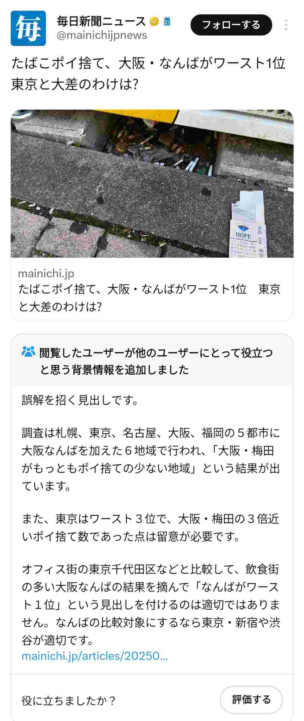 行政に改善を求めるため大阪はポイ捨てがひどいんだというデータが欲しかった大阪人 × そんな偏った調査を言い分通りに報道してしまった毎日新聞