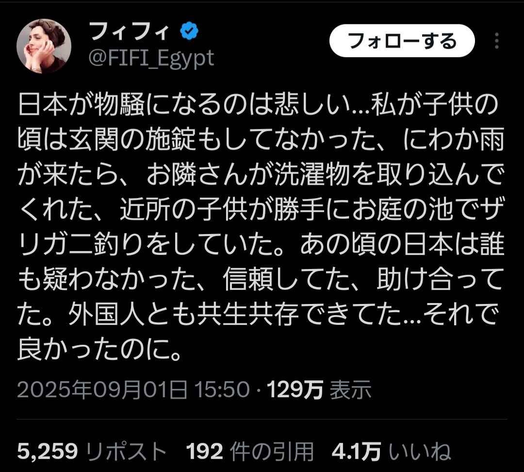 日本が物騒になるのは悲しい…私が子供の頃は玄関の施錠もしてなかった、にわか雨が来たら、お隣さんが洗濯物を取り込んでくれた、近所の子供が勝手にお庭の池でザリガニ釣りをしていた。あの頃の日本は誰も疑わなかった、信頼してた、助け合ってた。外国人とも共生共存できてた…それで良かったのに。