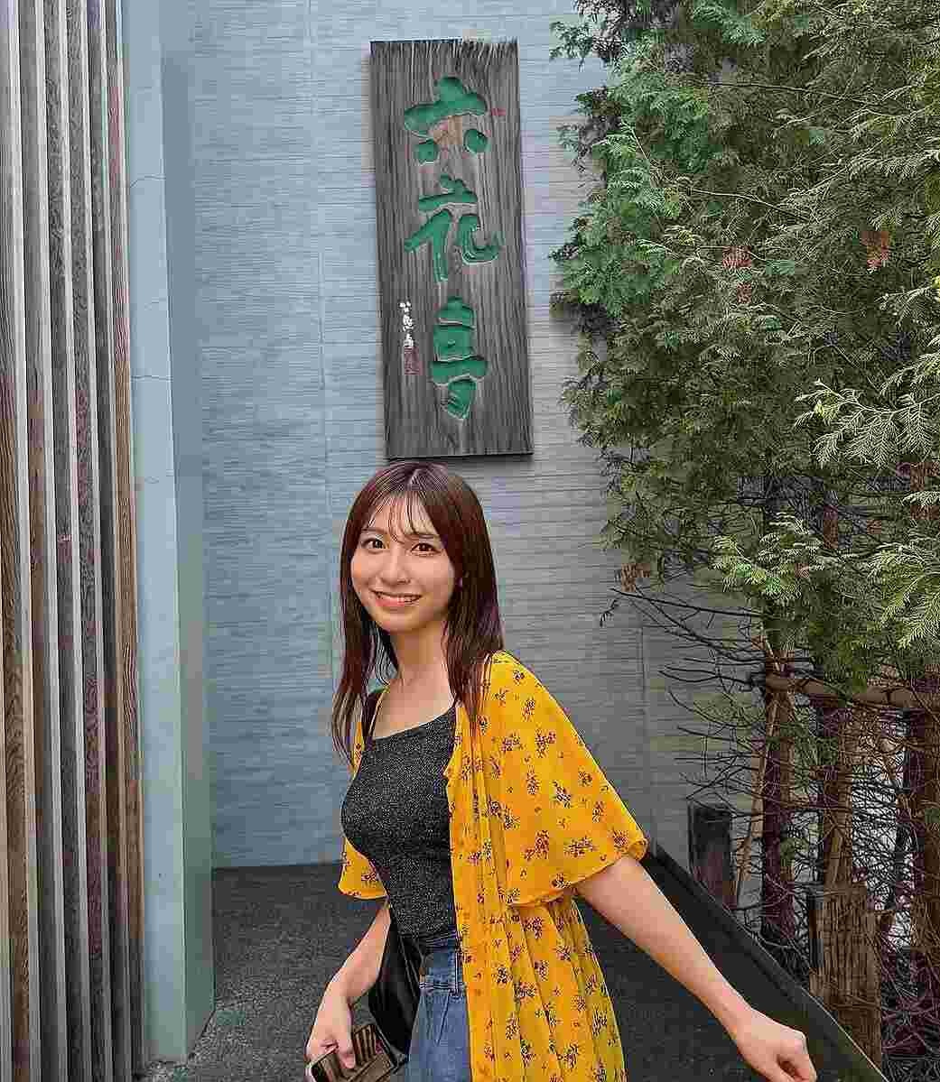黒のキャミソールとデニム、オレンジのロング丈カーディガンを羽織った夏らしい姿で「五稜郭が望める人気スポットの六花亭 五稜郭店はお店の入口も素敵でした」と、函館を満喫した様子。