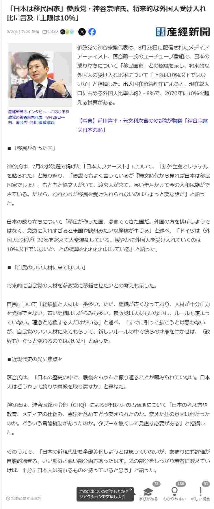 今の自民立憲だったら30パーとか移民入れそうだから助かる神谷