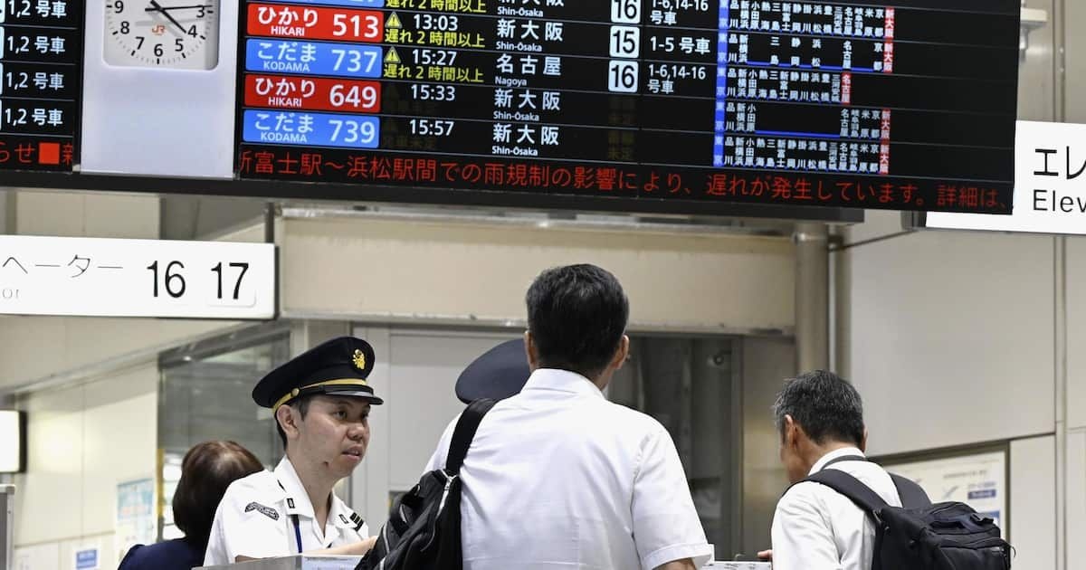 東海道新幹線は5日、台風15号による大雨の影響で、断続的に運転見合わせとなり、ダイヤが大幅に乱れた。JR東海によると、運休が計59本、遅れは計249本で最大約4時間15分だった。約17万人に影響した。愛知県や静岡県内で、雨量計が規制値を上回る場所が続出。山陽新幹線との直通が一時中止となった。到着が深夜から未明に及ぶ列車もあり、東京、名古屋、新大阪の各駅に「列車ホテル」を開設するという。東京駅や新大阪駅は、予定の変更を強いられた人たちで混雑した。