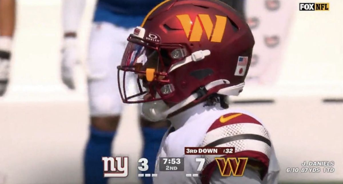 ワシントン・コマンダーズの先発クォーターバックが、ヘルメットの星条旗の下に別の国旗をかぶっているのを見るのは、かなり混乱を招きました。特に、彼は2024年のNFLシーズン中に同じ国旗をかぶっていなかったのですから。Daniels wore only one flag on his helmet as a rookie. It was the American flag.