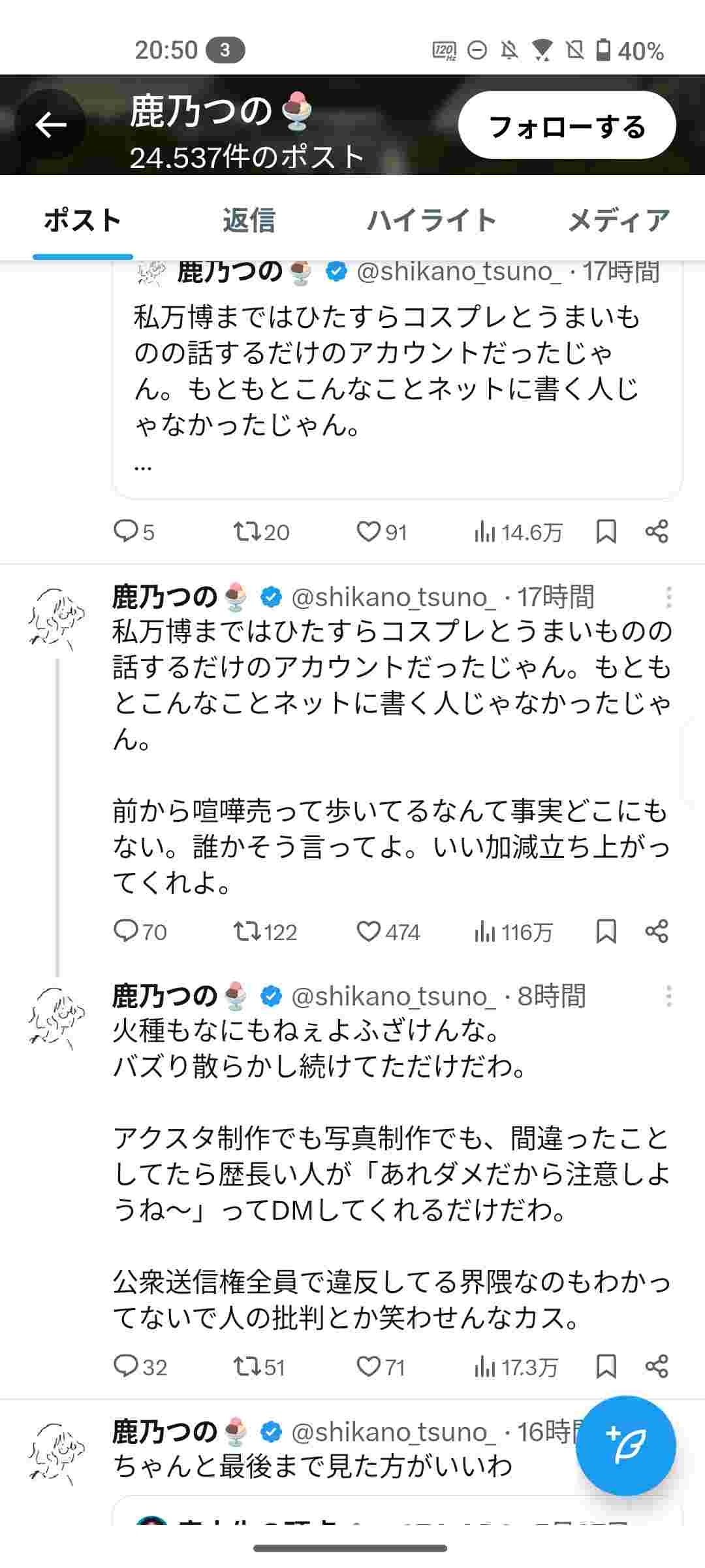 万博コス騒動からしばらくは女オタク憎しで迎合してる人もいたけど その後をあちこちに敵作りに行ってからは関わっては不味い人って気付いたのか離れていった 逆に未だに擁護してる人は何が目的なのかわからない