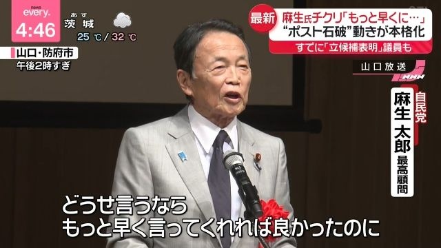 【辞任もっと早く言ってくれれば】自民党・麻生太郎最高顧問「まさか、きのう、石破総理大臣が辞められるという、総裁を辞任する話になるとは思ってなかったんですけど、どうせならもっと早く言ってくれれば良かったのに…」