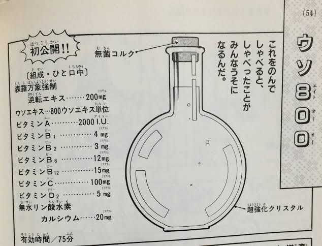 ウソ800には「森羅万象強制逆転エキス」が含有されており、この成分によって服用者から「うその指令」が発せられ、宇宙のあらゆることに対し、服用者が話した内容と反対の出来事が起こると解説されている。ちなみに同書によればウソ800の有効時間は75分間との事。