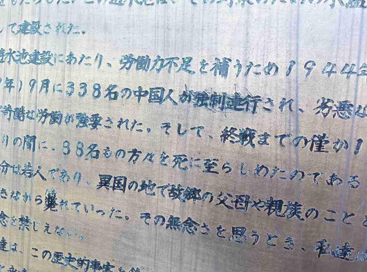 また上川遊水地内の「望郷」慰霊像の碑文の「強制労働」の部分が上から故意に傷つけられた痕跡も