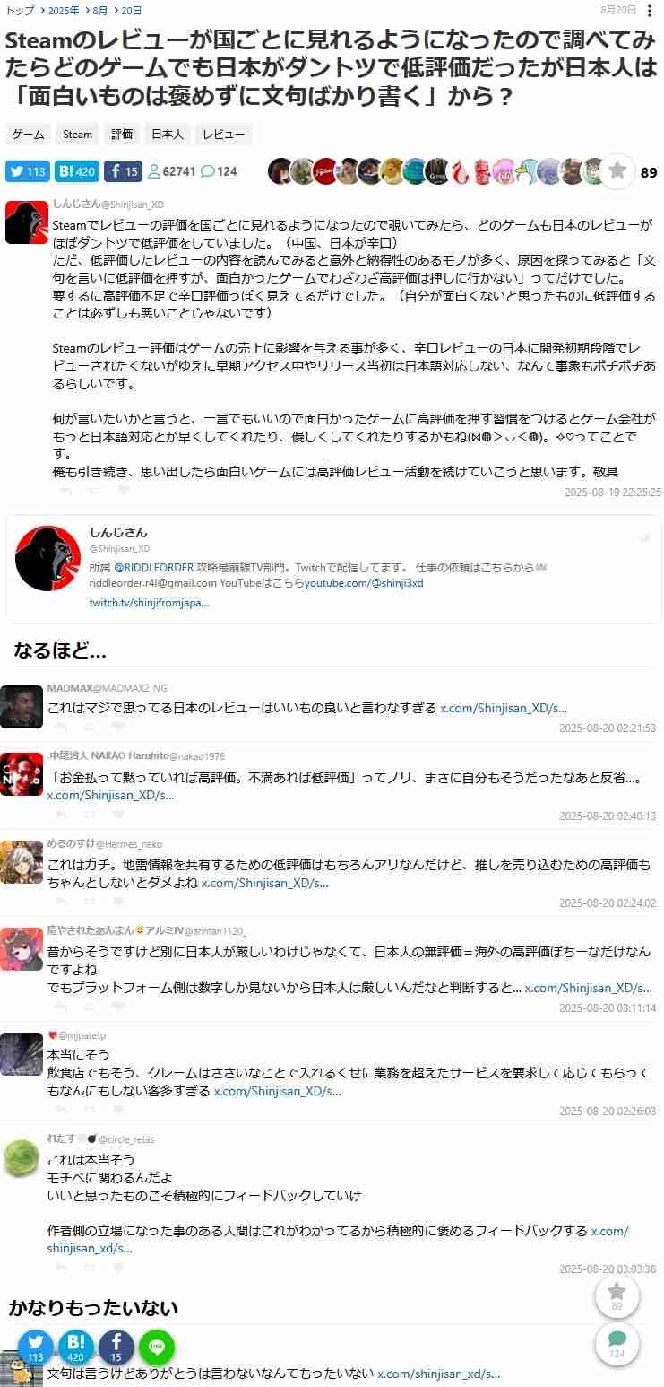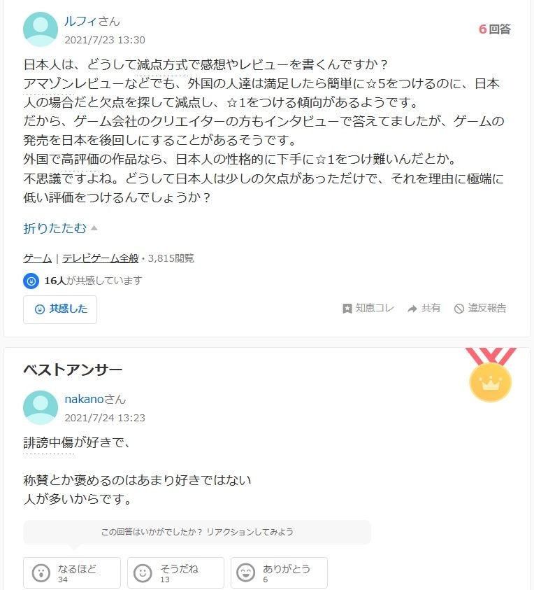 いや、単に正直な感想を言ってるだけじゃね?面白いか面白くないか、ちゃんと見極めてる証拠かもな。 スレタイの『日本人』で発火に成立しました。 BE[441660812]は通算117スレッドで4569レスのscriptを取得。