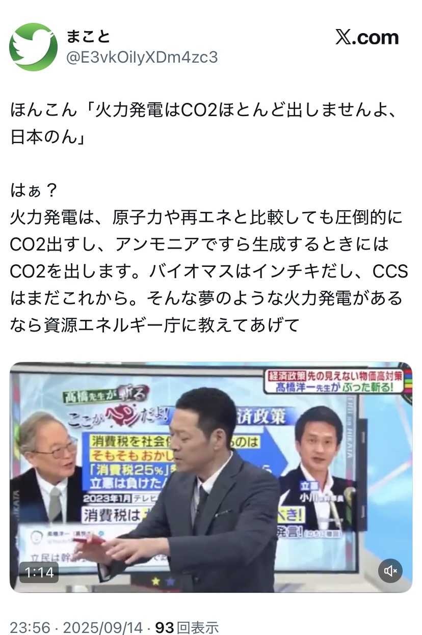 【動画】ほんこん「火力発電はCO2ほとんど出しませんよ、日本のん」