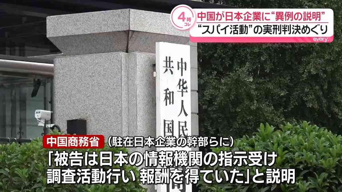 こうしたなか中国商務省が現地に駐在する日本企業の幹部らに「被告は日本の情報機関の指示を受けて、 中国国内で調査活動を行い、報酬を得ていた」とする異例の説明を行っていたことが新たにわかりました。