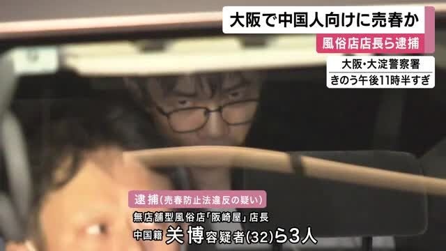 売春防止法違反の疑いで逮捕されたのは無店舗型風俗店「阪崎屋」の店長で中国籍の関博容疑者(32)ら3人です。
