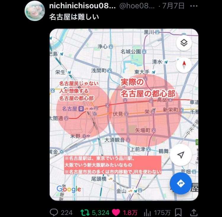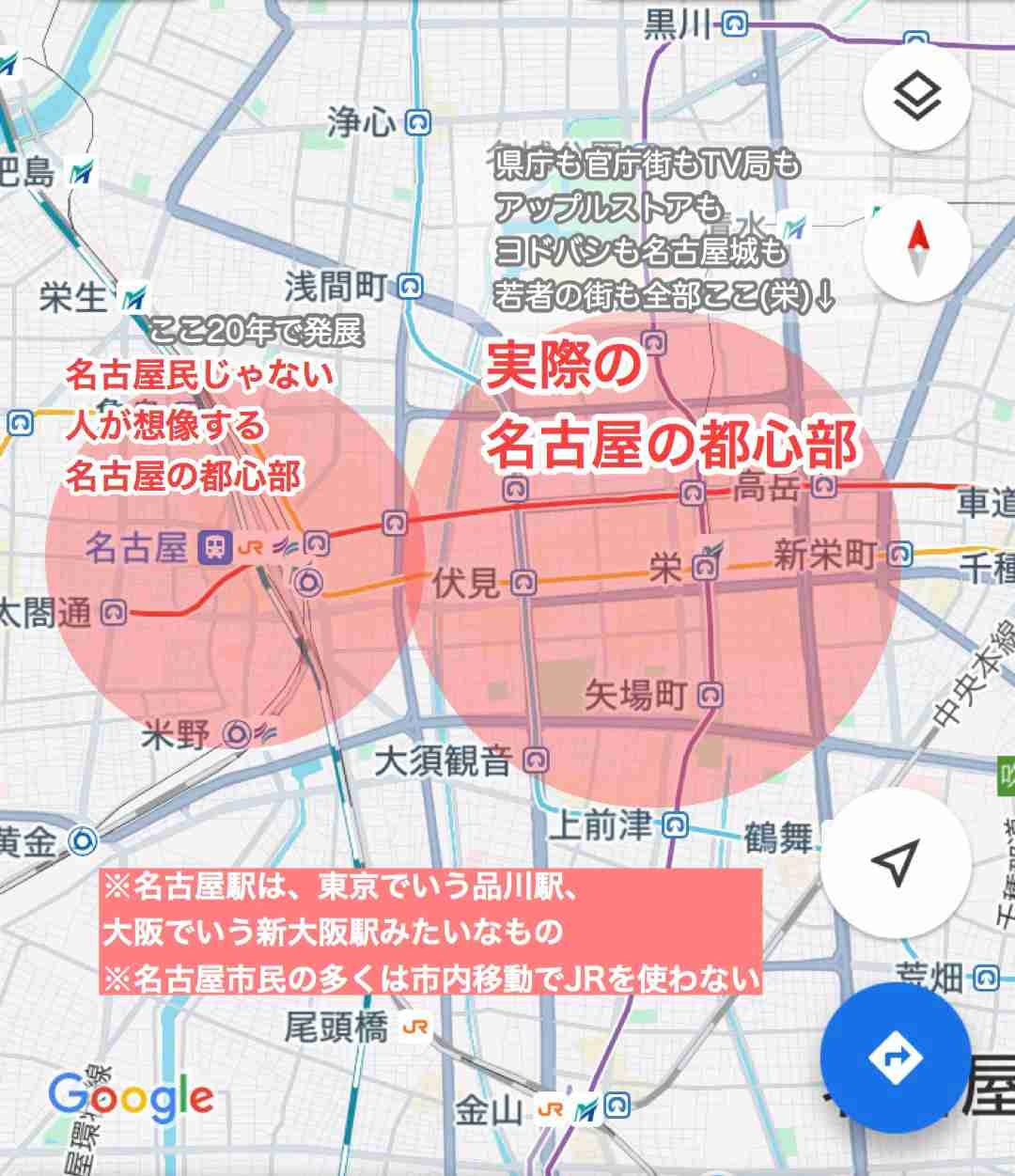 「栄」とかいう謎の場所が名古屋の中心で名古屋駅は名古屋では端の方らしい