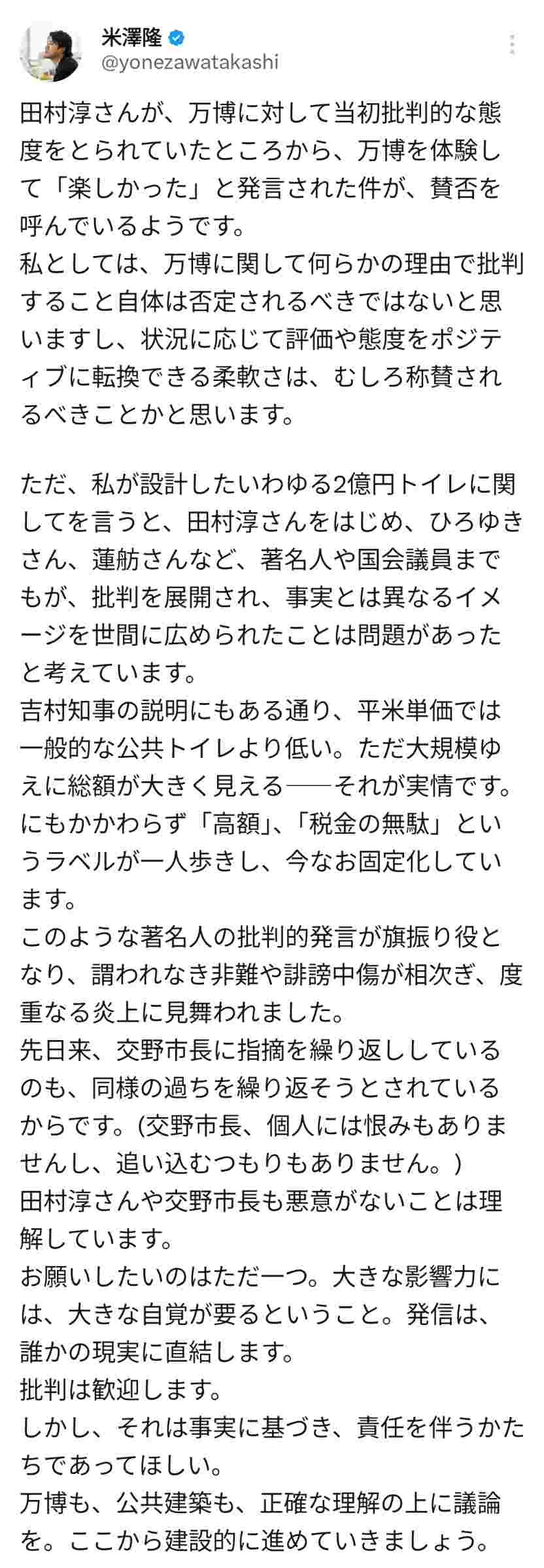 ただ、私が設計したいわゆる2億円トイレに関してを言うと、田村淳さんをはじめ、ひろゆきさん、蓮舫さんなど、著名人や国会議員までもが、批判を展開され、事実とは異なるイメージを世間に広められたことは問題があったと考えています。