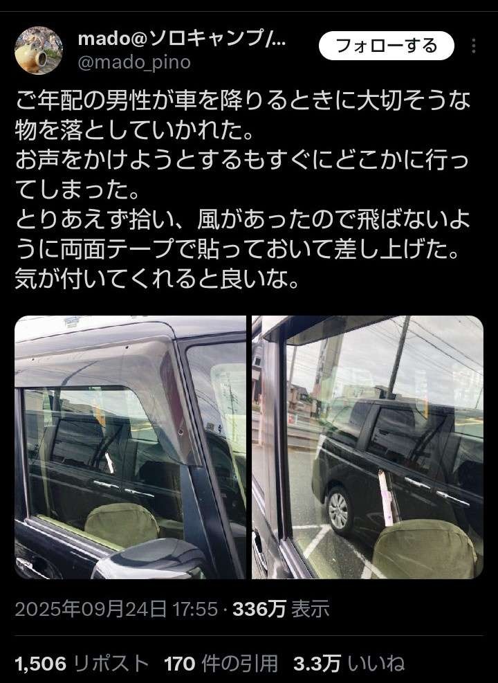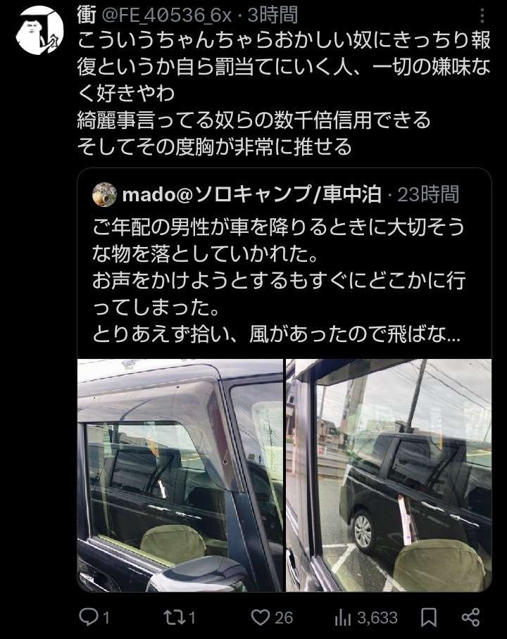 日本人「車降りる時にお爺さんがタバコをポイ捨てしていたので車の窓にテープで吸い殻貼り付けてあげました」3万いいね