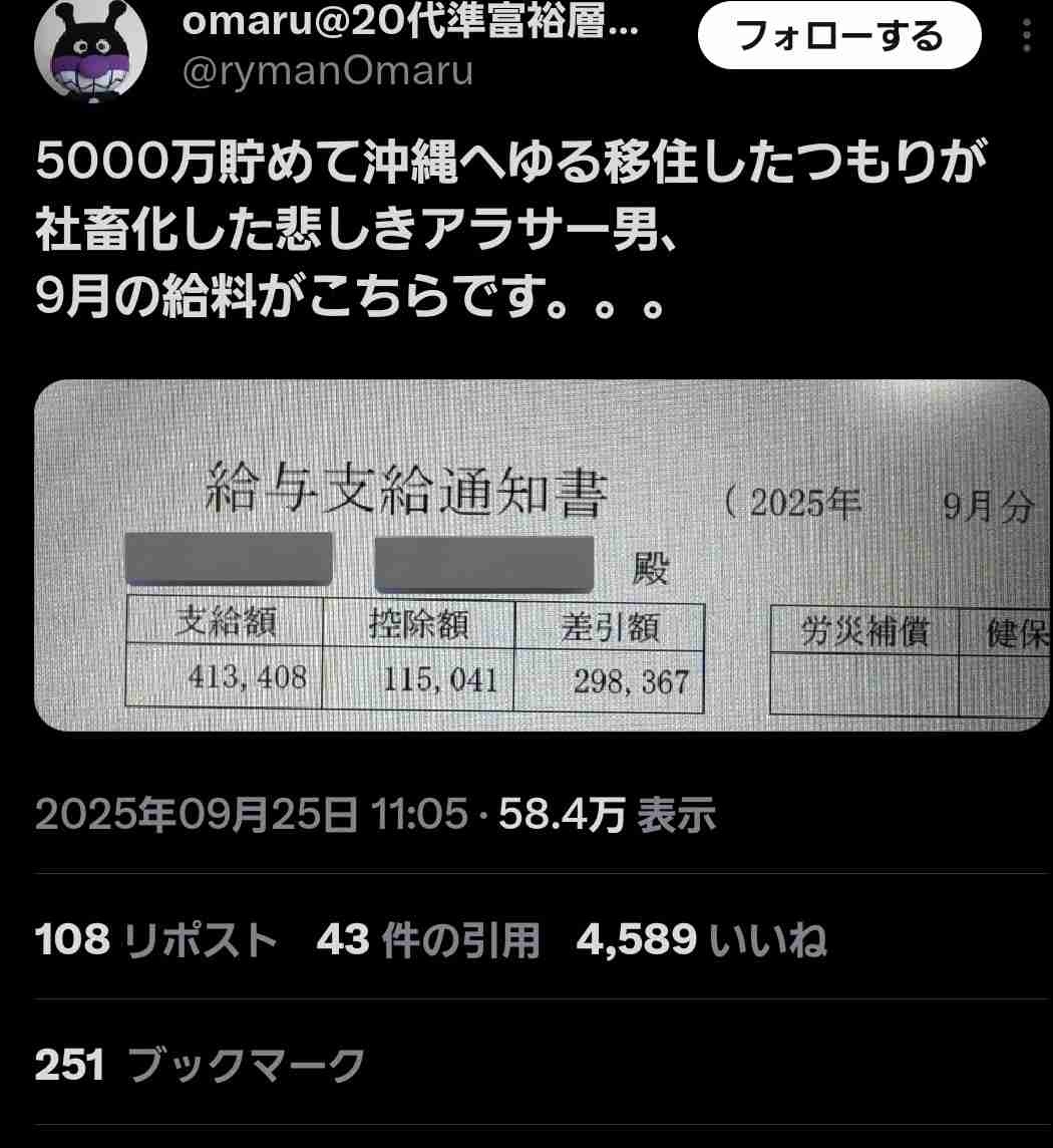 20代で5000万貯めて沖縄へ移住した男、今月の給料を公開。ケンモメンといい勝負か?
