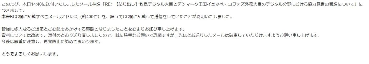 誤送信は同日午後2時40分ごろに発生。牧島かれんデジタル相が、デンマークとデジタル分野における協力覚書を締結したとするプレスリリースの送信時に、アドレスをCC欄に誤って記載した。このため、報道各社の担当者約400人分のアドレスが、同庁のメーリングリストの登録者には閲覧できるようになっていた。