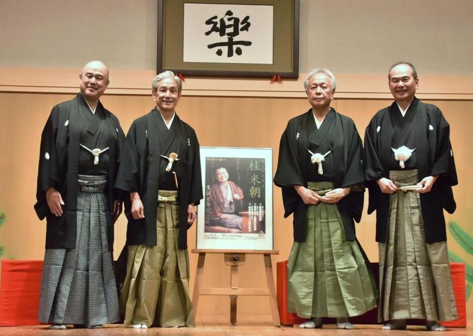 (左から)笑福亭生喬、桂米団治、桂米二、笑福亭仁智上方落語協会は30日、大阪・天満天神繁昌亭で「桂米朝 生誕百周年ウイーク」(10月20~26日)と「文化勲章受章 桂米朝 生誕百年記念月間」(11月3~30日)の開催を発表した。