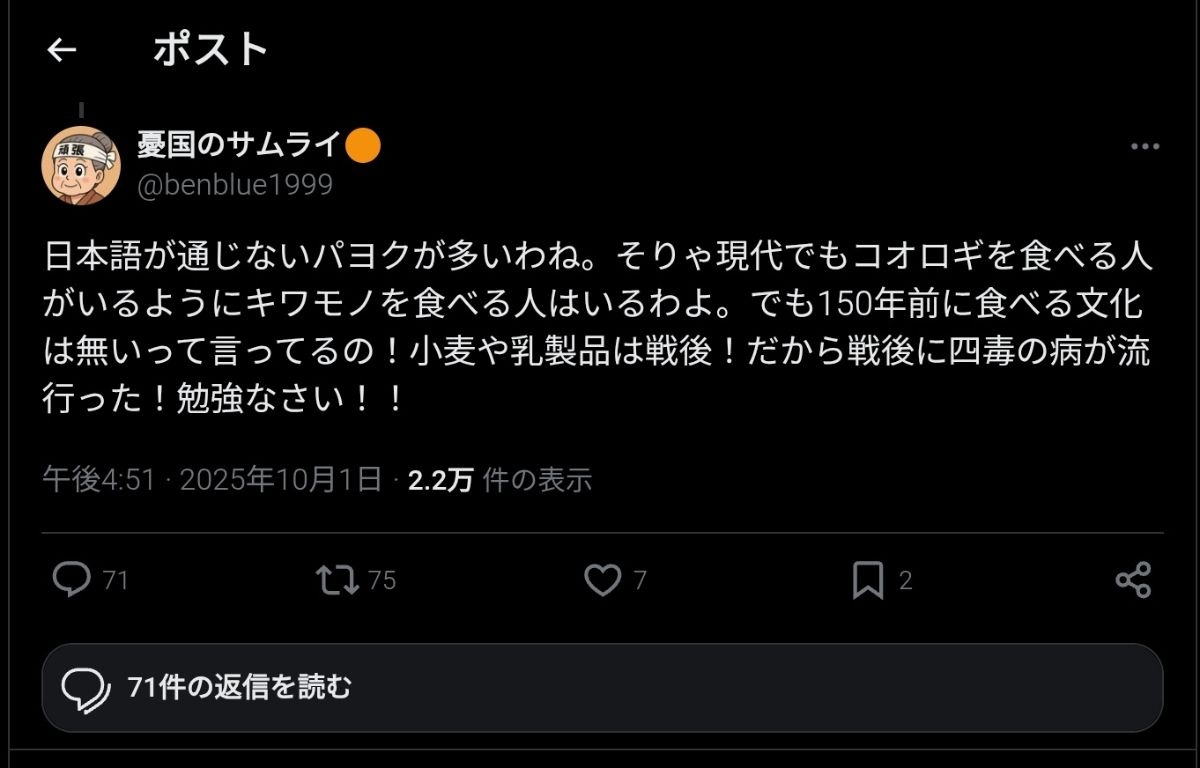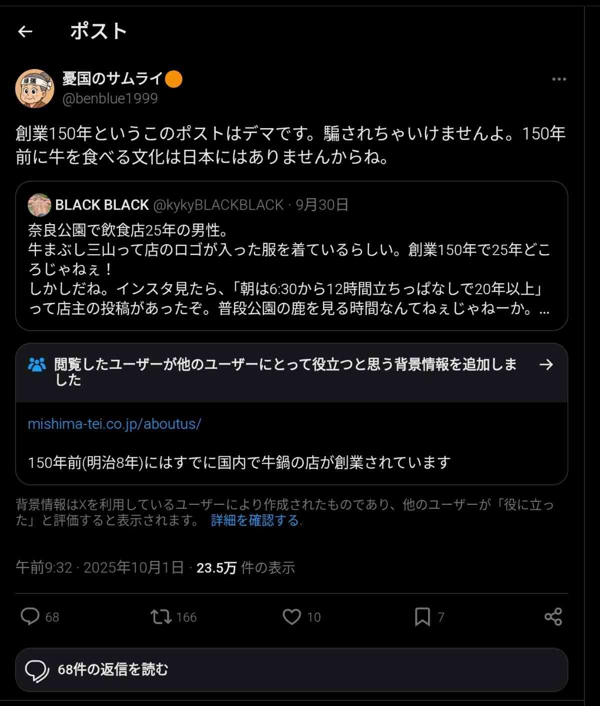 https://x.com/benblue1999/status/1973184148694245619↓ noteがつく(150年前(明治8年)にはすでに国内で牛鍋の店が創業されています)