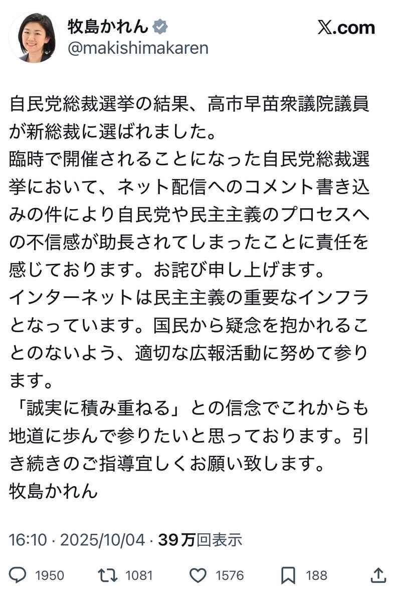 牧島がジェンダー政策を主張しながら、右派の高市のことは政策的に大嫌いなのは確実
